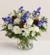 Inspired by winter’s cool blue and white landscape, our arrangement delivers warm wishes to those you love. The lush gathering of blooms, evergreens, and rustic touches is a thoughtful sentiment filled with the season’s natural beauty; its palette is especially well suited for Hanukkah celebrations.